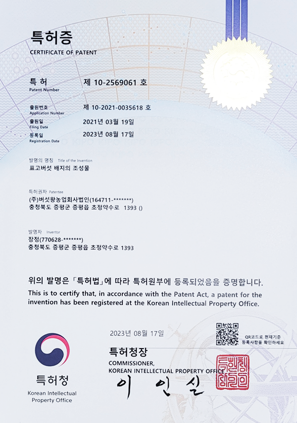 표고버섯 배지의 조성물 특허증